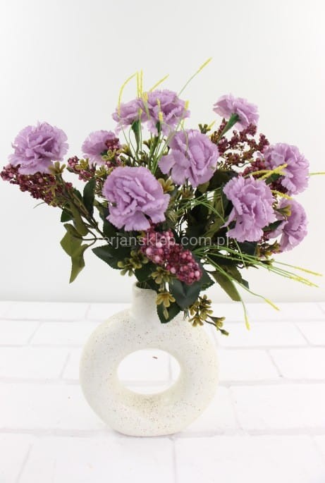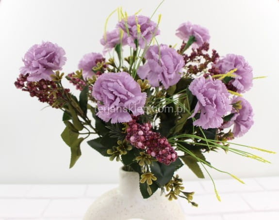 Bukiet z goździkami zawiera 13 gałązek. Uroku dodają drobne fioletowe kuleczki jako dodatek.