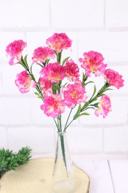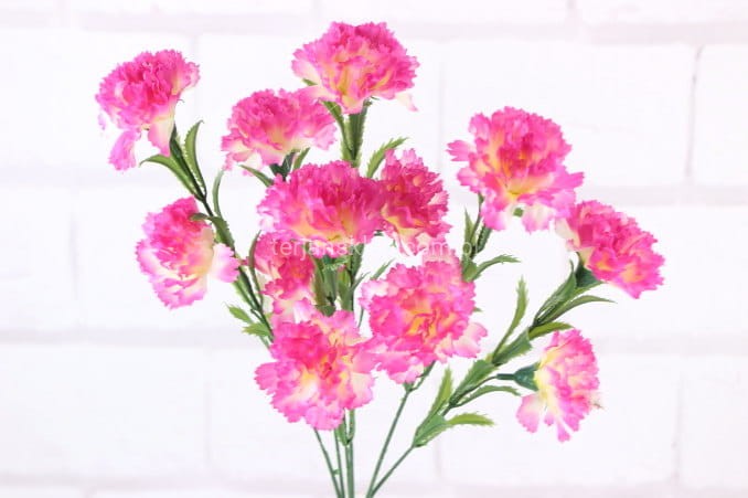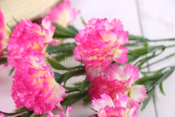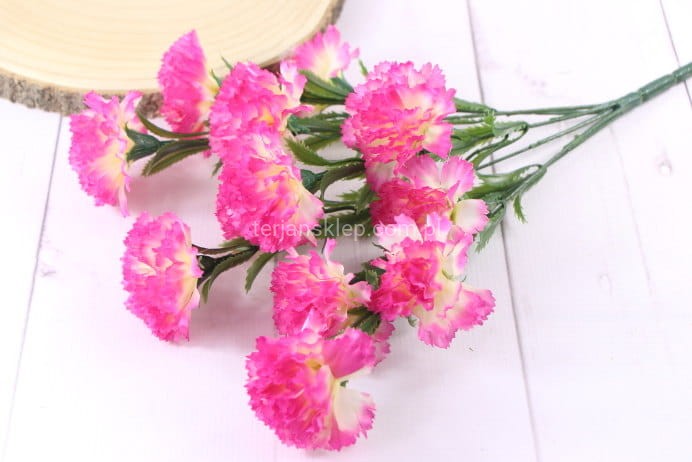 Uroczy bukiet goździków. Gęsty, z dużą ilością kwiatów.