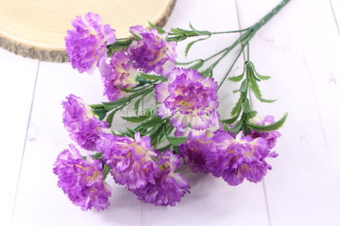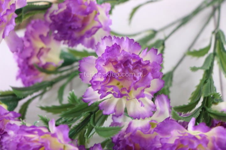 Uroczy bukiet goździków. Gęsty, z dużą ilością kwiatów.
