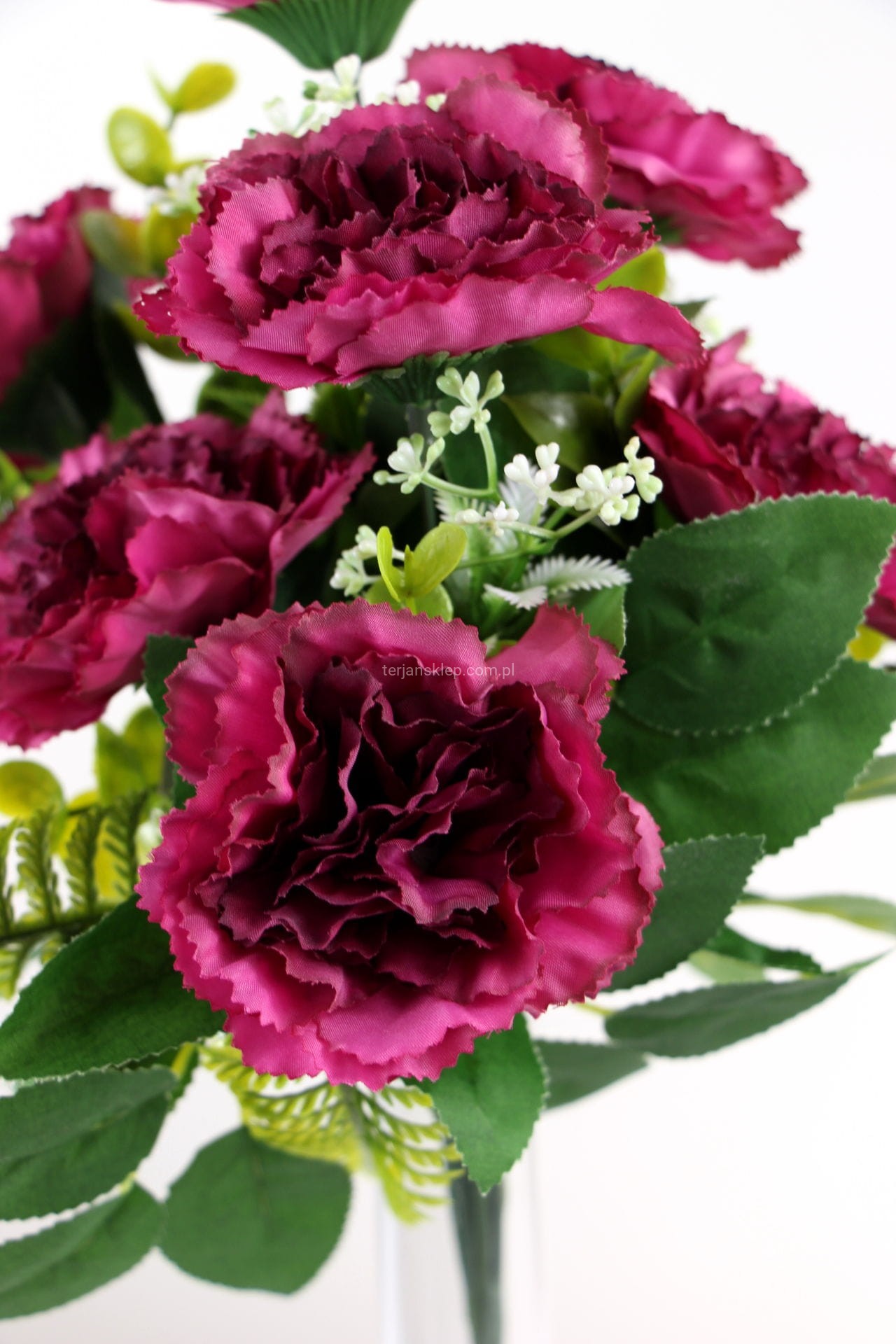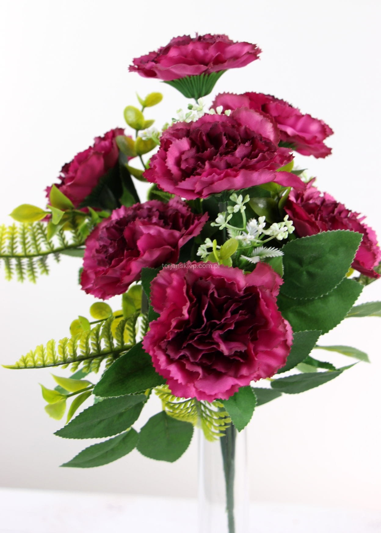 Bardzo ładny bukiet goździków o max. wysokości 34 cm. Bukiet ma 7 gałązek z kwiatami i ładnymi dodatkami. Kwiaty są sztywne i mają średnicę ok 8-9 cm.