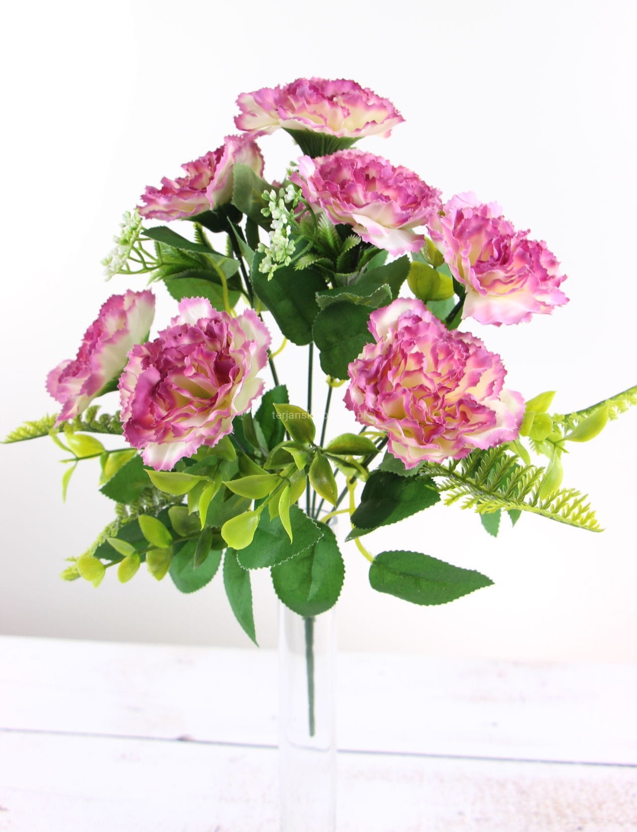 Bardzo ładny bukiet goździków o max. wysokości 34 cm. Bukiet ma 7 gałązek z kwiatami i ładnymi dodatkami. Kwiaty są sztywne i mają średnicę ok 8-9 cm. Cena za 1 bukiet.