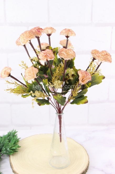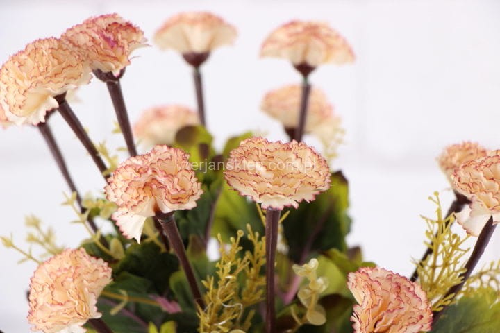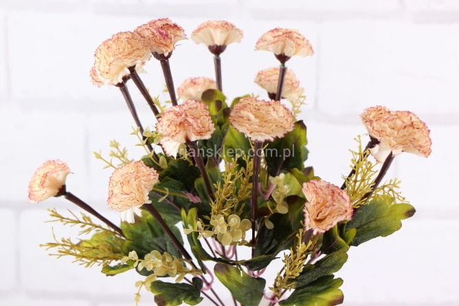 Piękny bukiet goździków. Bardzo ładne kolory i jakość wykonania. Jesienne, lekko przydymione liście. Bukiet składa się z 14 gałązek, max. wysokość 42 cm. Orientacyjna średnica kwiatka to 5 cm. Cena dotyczy 1 sztuki bukietu.