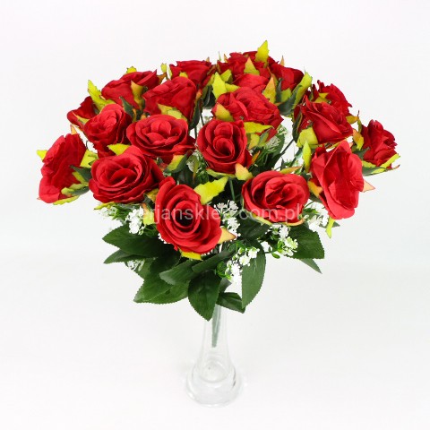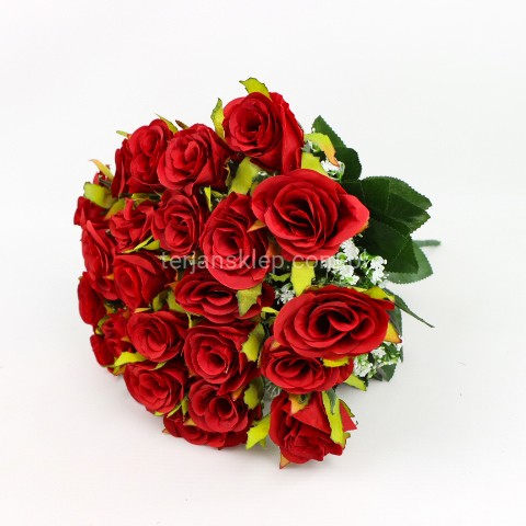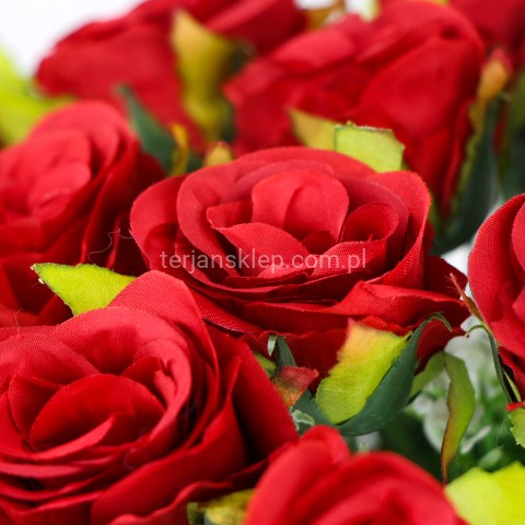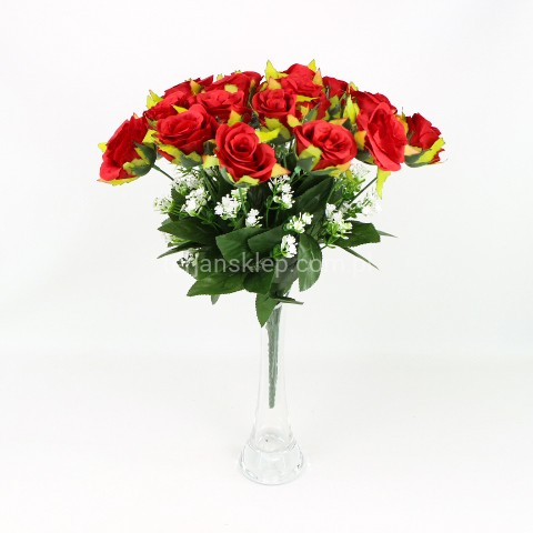 Całkowita wysokość bukietu to 38 cm. Wymiary główki róży: h = 5 cm, a średnica 6 cm.