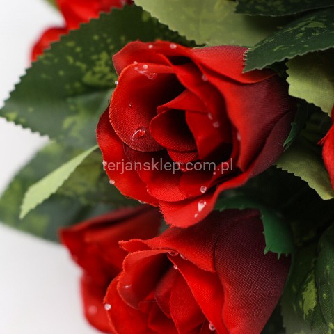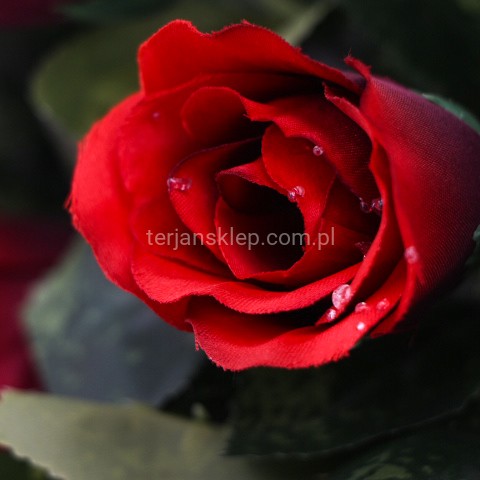 Ładne kwiaty ze sztucznymi kroplami, a uroku dodają gęste liście.