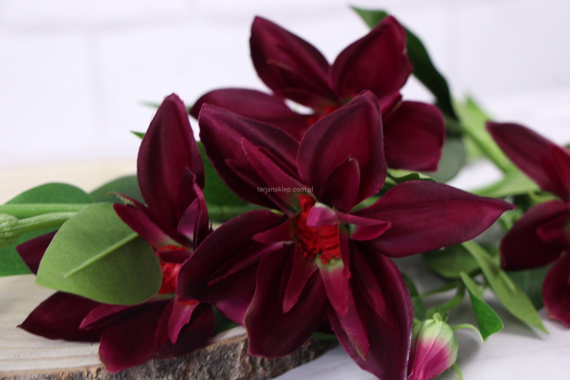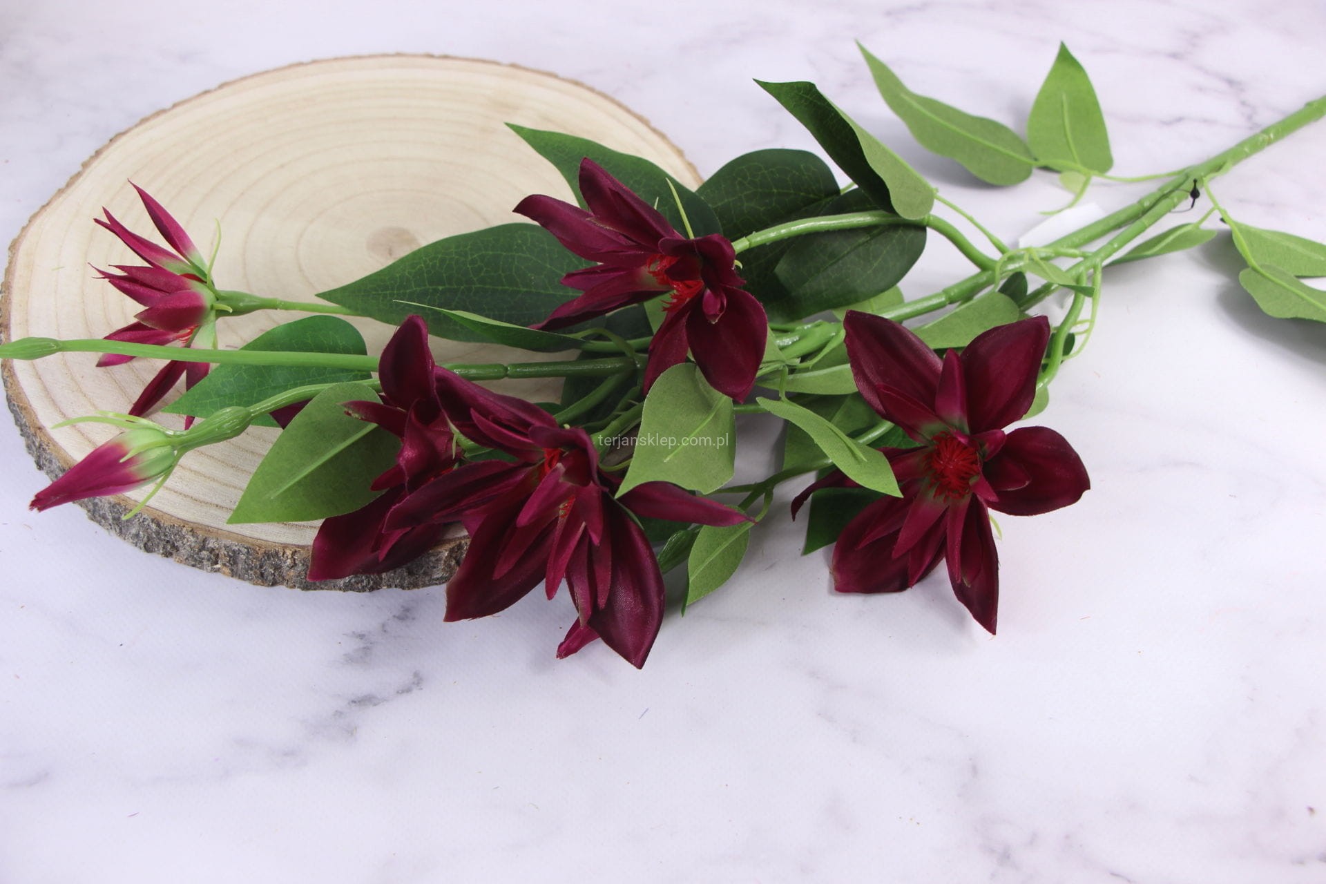 Śliczna gałąź kwitnącego Clematisa. Kwiaty wykonane są z satyny. Wysokość całości to 85 cm. Największe kwiaty mają średnicę ok 12 cm. Cena dotyczy 1 gałęzi.