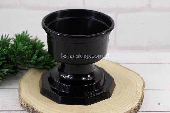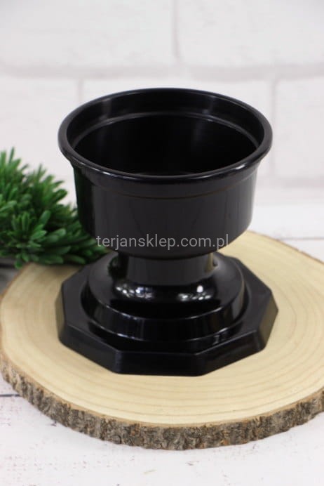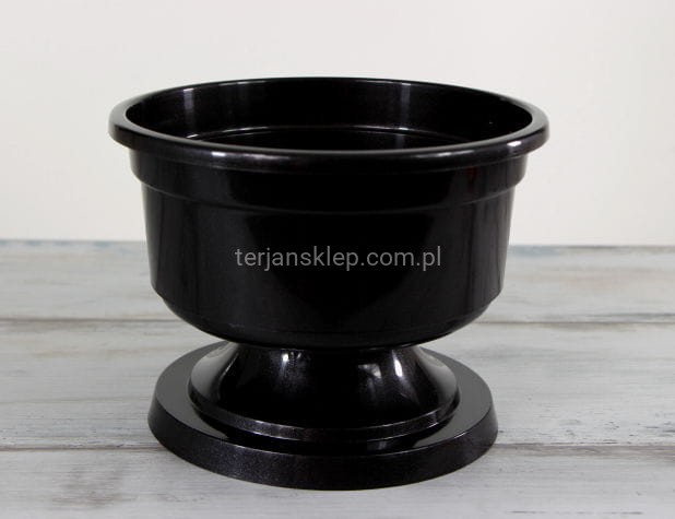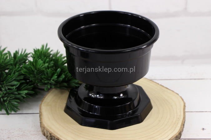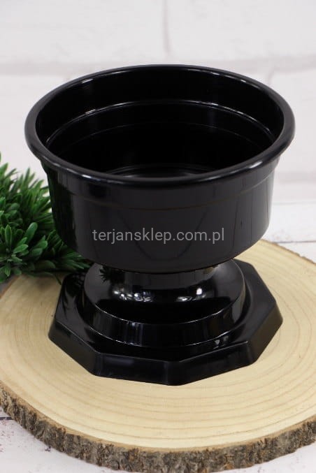 Doniczka na nóżce - idealna jako baza do kompozycji nagrobnych. Średnica 18 cm, wysokość (z nóżką) 14 cm. Cena dotyczy 1 sztuki.