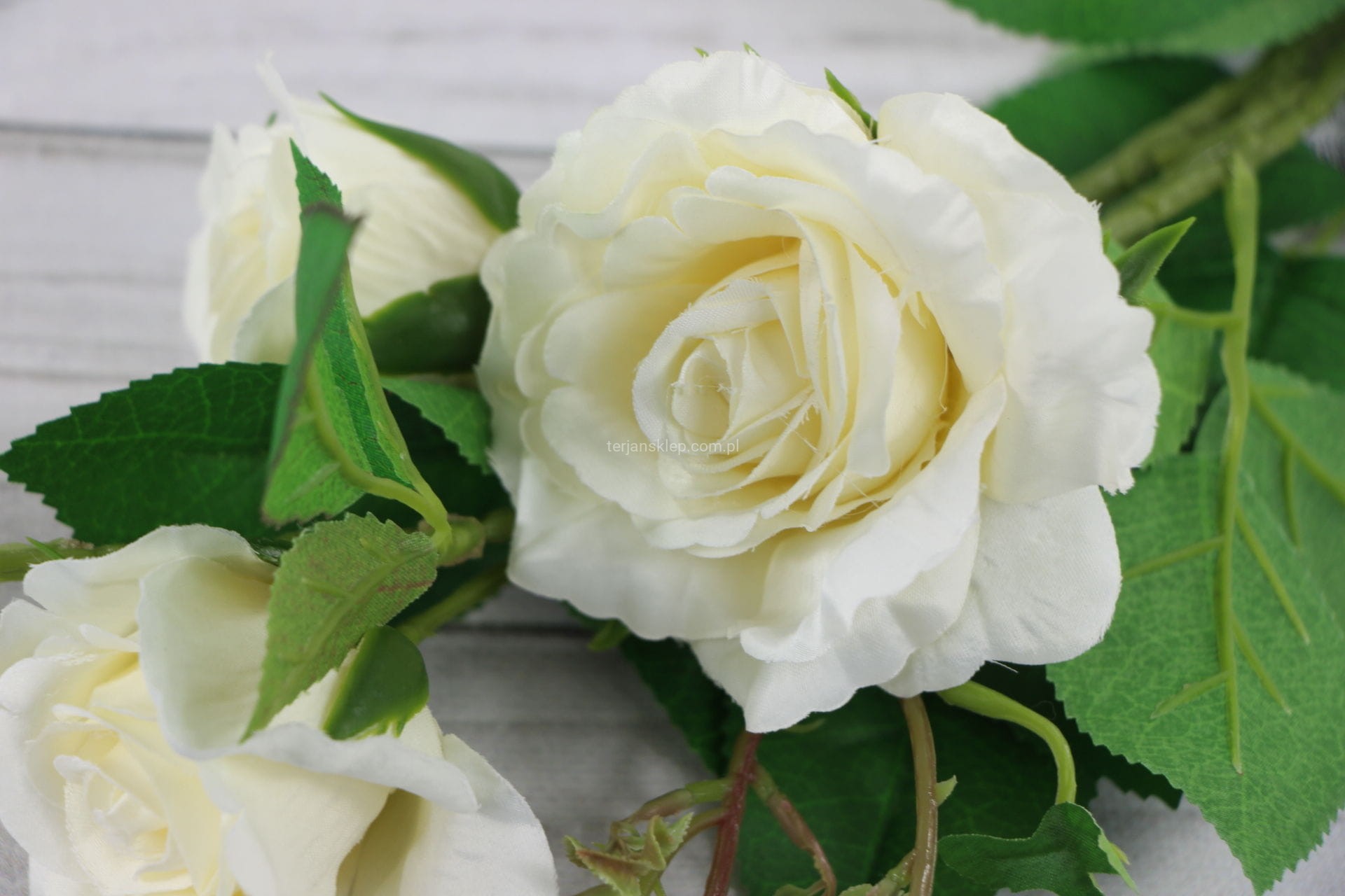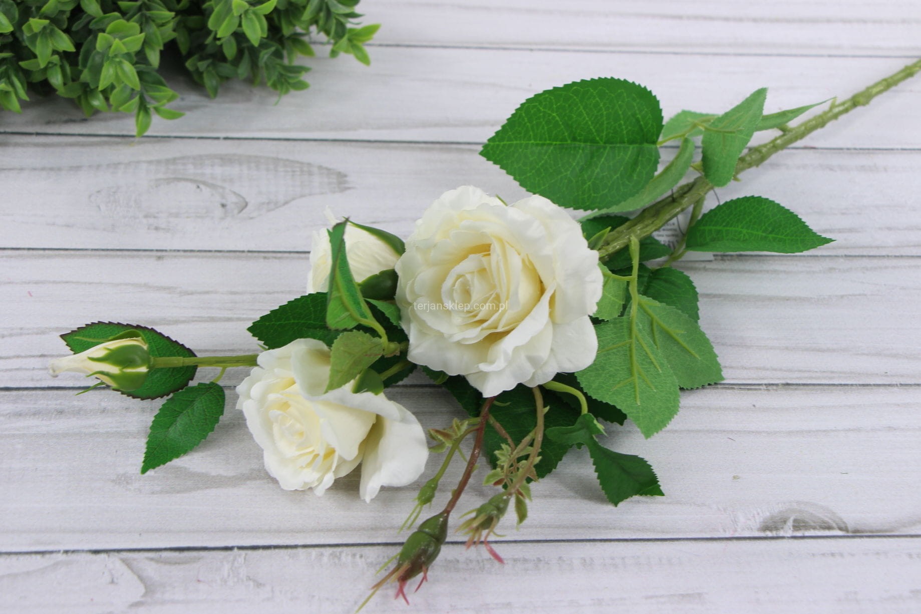 Wysokiej jakości gałązka z 3 różami. Kwiaty wysokiej jakości, wykonane z satyny, wyglądają bardzo naturalnie. Dopracowane detale - liście, kolce, itp. Wysokość całości to 73 cm. Cena dotyczy 1 gałązki.