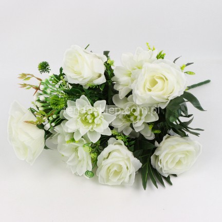 Kompozycja z różami i daliami, z dodatkami i liśćmi. Ładnie skomponowany bukiet.