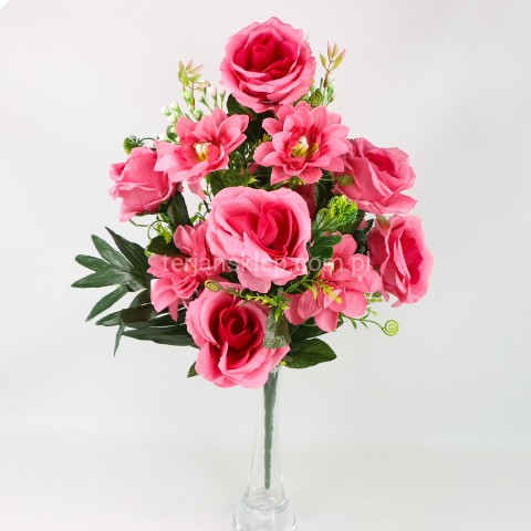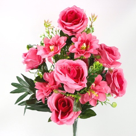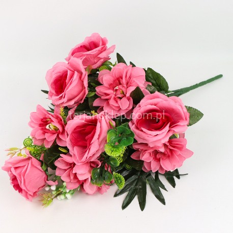 Kompozycja z różami i daliami, z dodatkami i liśćmi. Ładnie skomponowany bukiet.