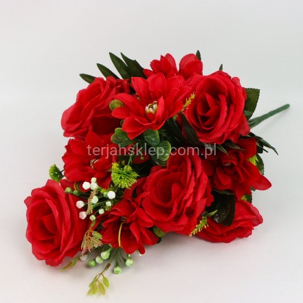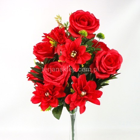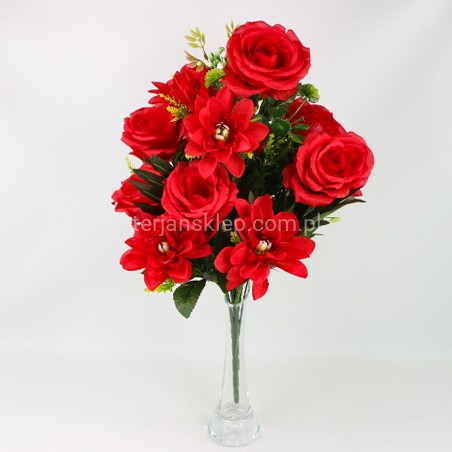 Kompozycja z różami i daliami, z dodatkami i liśćmi. Ładnie skomponowany bukiet.