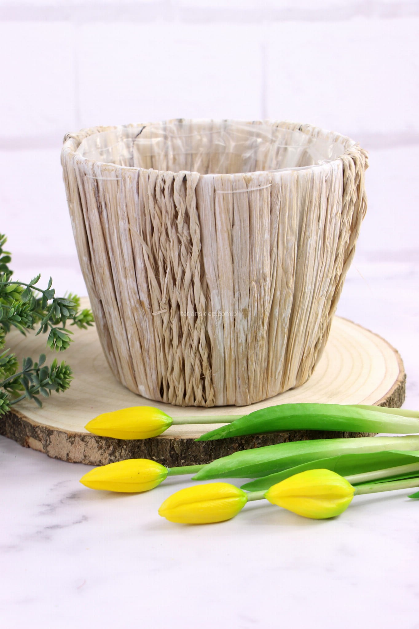 Piękna i w stylu EKO. Może służyć jako wazon do sztucznych kwiatów, osłonka na doniczkę albo jako flower box. Średnica to 17 cm, wysokość osłonki to 14 cm. W środku znajduje się folia.