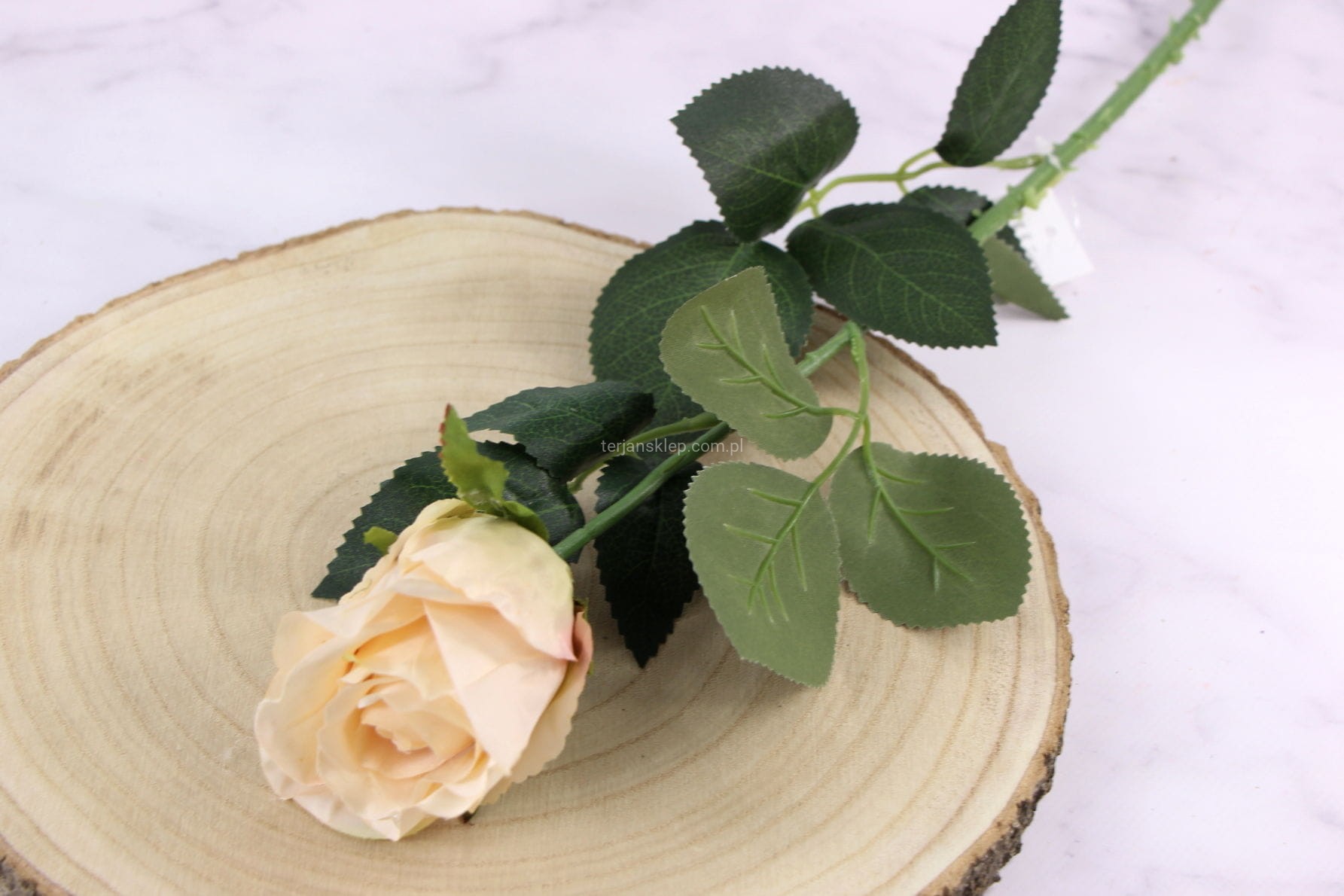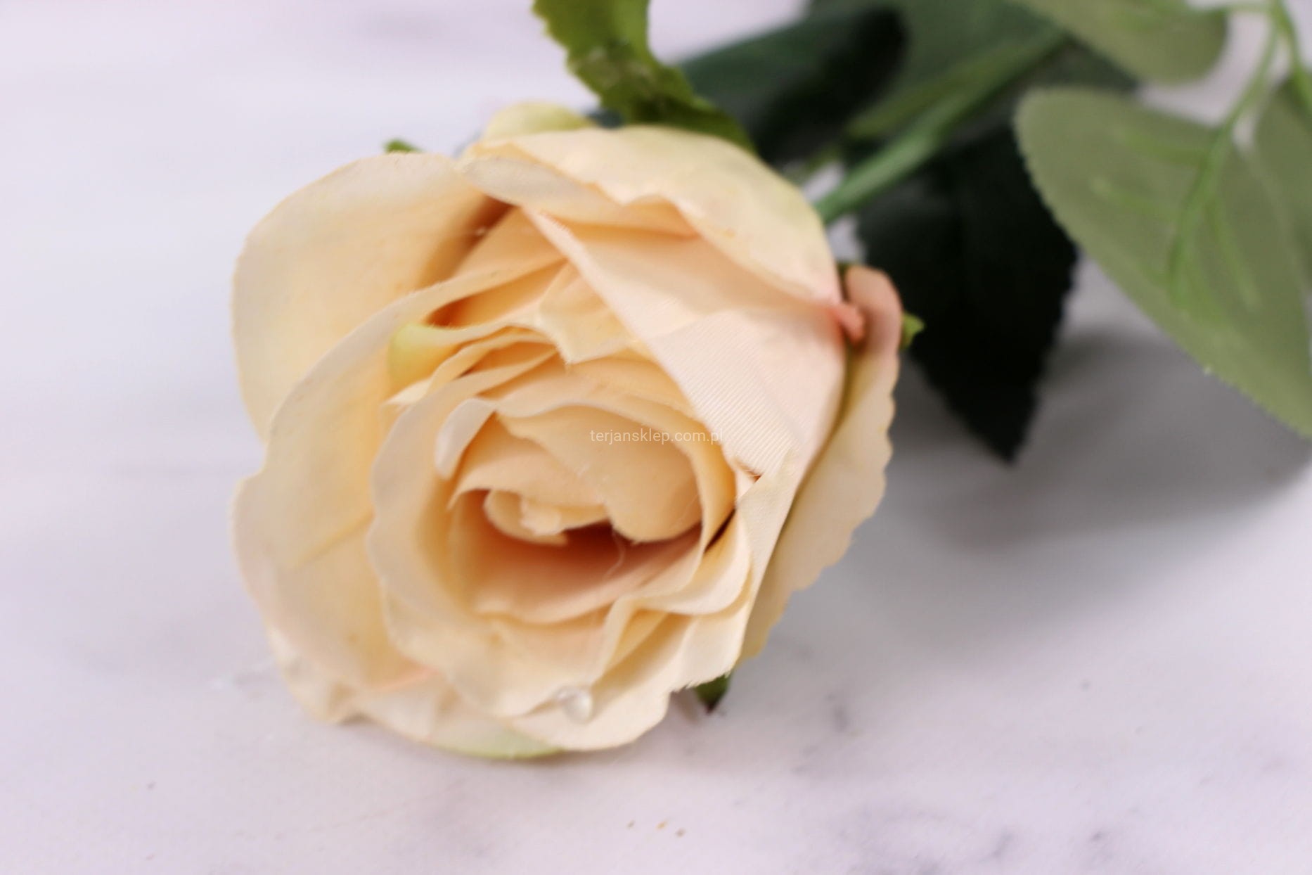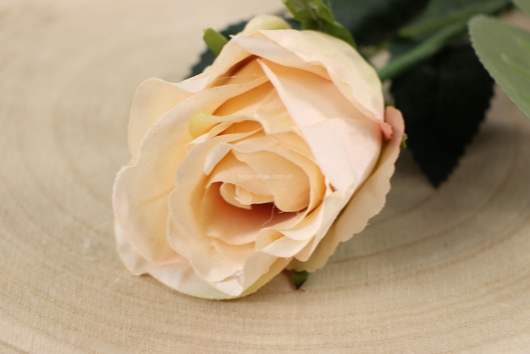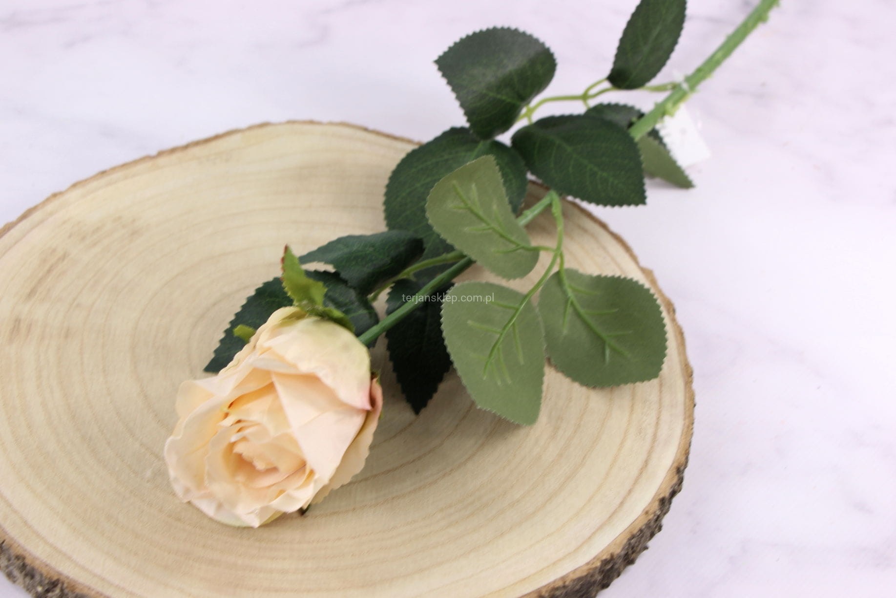 Ślicznej urody róża gałązkowa. Kwiat wykonany jest z wysokiej jakości satyny. Łodyga ma kolce i ładne liście. Kwiat w środku posiada styropianową kulkę, dzięki czemu się nie odkształca.