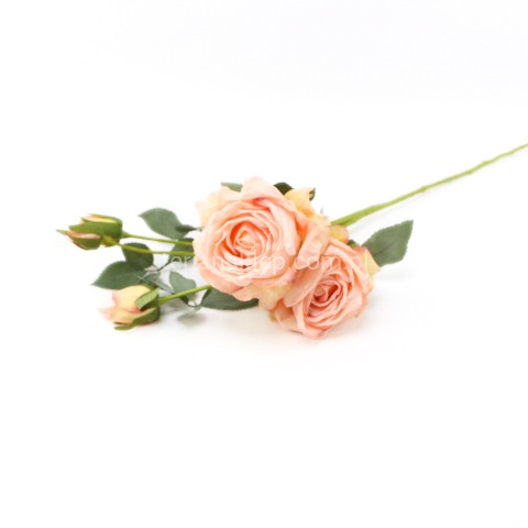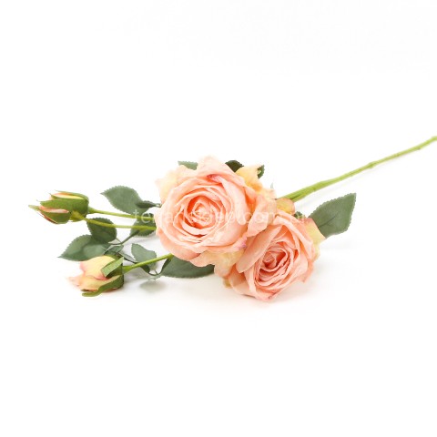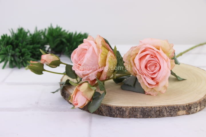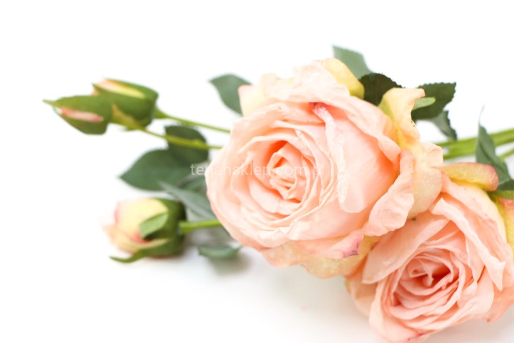 Piękne, wysokiej jakości kwiaty róży (średnio rozwinięty). Sztywne kwiaty sprawiają wrażenie, że końcówki płatków są lekko opalone / podsuszone. Łodyga i liście omszałe w kolorystyce stonowanej zieleni.