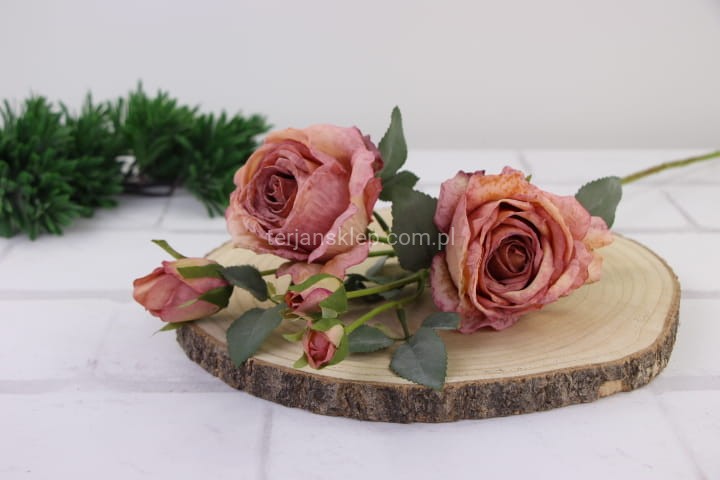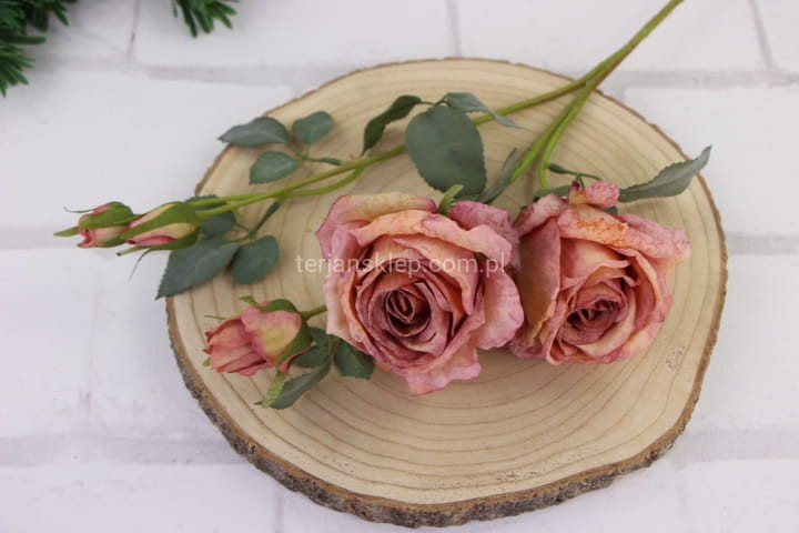 Piękne, wysokiej jakości kwiaty róży (średnio rozwinięty). Sztywne kwiaty sprawiają wrażenie, że końcówki płatków są lekko opalone / podsuszone. Łodyga i liście omszałe w kolrystyce stonowanej zieleni.