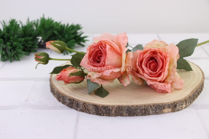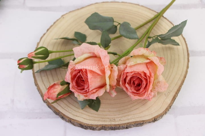Piękne, wysokiej jakości kwiaty róży (średnio rozwinięty). Sztywne kwiaty sprawiają wrażenie, że końcówki płatków są lekko opalone / podsuszone. Łodyga i liście omszałe w kolorystyce stonowanej zieleni.