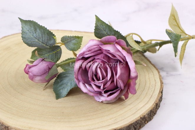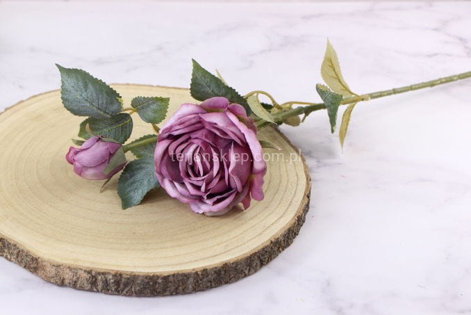 Piękna gałązka róży posiadająca 2 stylowe kwiaty i ładne, omszałe liście.