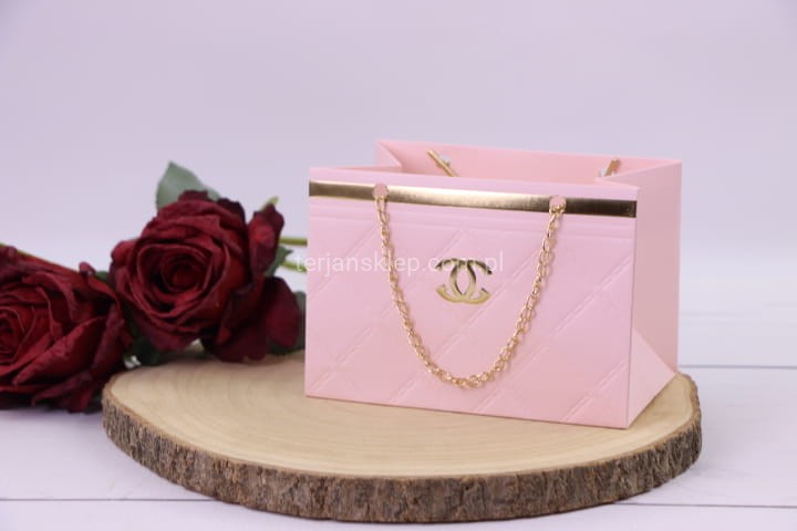 Torebka wykonana jest z grubego, lakierowanego papieru. Ma solidne uszy wykonane ze złotych łańcuszków.