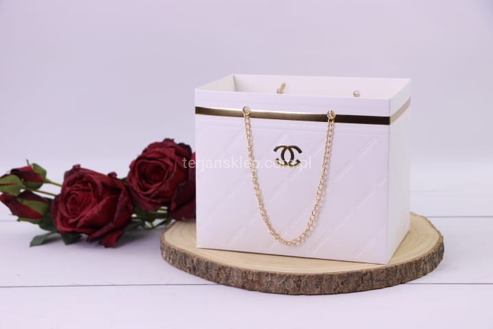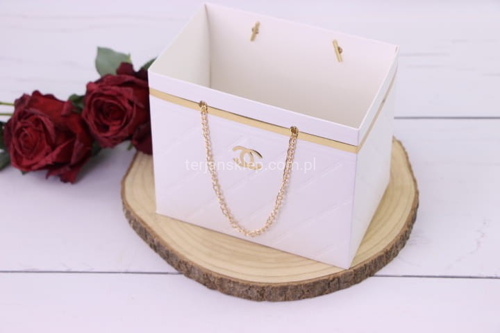 Torebka wykonana jest z grubego, lakierowanego papieru. Ma solidne uszy wykonane ze złotych łańcuszków.