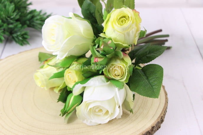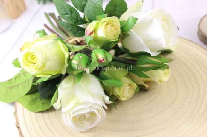 Wiązka związana jest rafią. Znajdują się w niej piękne pąki róż o różnych rozmiarach. Orientacyjna średnica kwiatów to 1,5 - 3 cm.